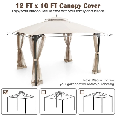 - For 10′ x 12′ Gazebo: Designed to fit an outdoor 10′ x 12′ gazebo, this canopy top cover offers a large area to protect from sun and rain. This large canopy replacement roof can create a cozy outdoor area for you and your family or friends to enjoy your leisure time.
