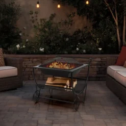 Costway Outdoor Wood Burning Fire Pit Steel Patio Stove W/ Log Storage Rack & Wheels