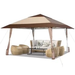 Costway 12′ X 10′ Outdoor Patio Gazebo Canopy Shelter Double Top Sidewalls Netting Brown Beige