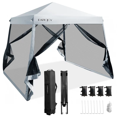 Our instant pop-up canopy tent measures 10 x 10 x 7.8-8.4 ft (L x W x H), providing a large shading area for various outdoor activities, such as backyard family gatherings, lawn BBQ parties, camping, picnics, beach parties, and more. Thanks to the easy center push mechanism, the canopy tent can be easily set up and taken down with no tools required. And the telescoping legs offer 3 height levels (7.8 ft, 8.1 ft, 8.4 ft) for different occasions according to your needs. The canopy is crafted with durable oxford fabric and coated with premium silver, which features excellent UPF 50+ sun protection and rain resistance. And there exist mesh sidewalls on 4 sides, allowing you to enjoy the beautiful scenery while keeping out the bugs. In addition, the frame is constructed of powder-coated steel, which is anti-rust and durable, ensuring long-term outdoor use. And we also provide extra 4 wind ropes, 8 metal stakes, 4 sandbags, and 4 plastic pegs with stake holes to firmly fix the canopy on the ground, adding more stability and safety. Other than that, our roller bag is designed with 2 wheels for easy movement and a carrying bag for easy storage, so you can easily take the canopy tent to the beach, campsite, lawn, park, or anywhere you want.