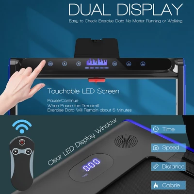 - Dual LED Display & Remote Control: This electric treadmill is designed with dual LED display. The upper LED screen is touchable. If you press the pause/continue key, the exercise data will remain about 5 minutes. The bottom LED display window can be operated by remote control and feedback your exercise data(time/speed/distance/calorie).
