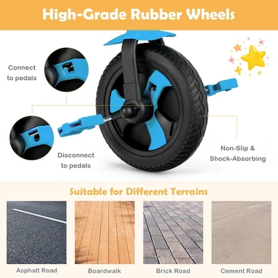 - High-Grade Rubber Wheels: The two rubber wheels with textured surface are not only non-slip, but also shock-absorbing. Therefore, the kids bike can be ridden smoothly on a variety of roads like asphalt road, boardwalk, brick road and cement road. And the clutch on the front wheel is functional to connect or disconnect to the pedals.