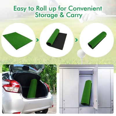 Equipped with premium artificial turf, this golf hitting mat can simulate the realistic feeling of playing at fairway, offering realistic practice experience at both indoor and outdoor places like patio, backyard and living room. Also, the thick and non-slip base is made of high resilient TPR material which can absorb the impact when the mat is hit. So your club’ service life is ensured and your wrists are also protected. In addition, this golf putting mat not only features 2 tee positions, but also comes with 3 rubber tees for common practice. For convenient storage and transport, you can roll it up.