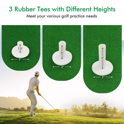- Designed for Both Right & Left Handers: Featuring 2 tee positions on both side, this golf practice grass mat is suitable for all players including right handers and left handers. Also, the golf mat comes with 3 rubber tees with common driver tee heights of 1.5”/4cm, 2”/5.5 cm and 2.75”/7 cm, and the 1.5”/4cm rubber tee can be used to insert real golf tees.
