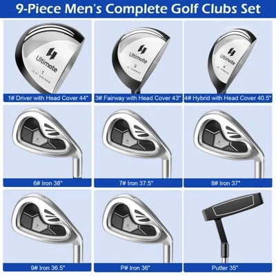 - 9-Piece Men’s Complete Golf Clubs Set: Including 1# driver with head cover, 3# fairway with head cover, 4# hybrid with head cover, 6# iron, 7# iron, 8# iron, 9# iron, P# iron and putter, this 9-piece right-handed complete golf club set is a perfect gift for male golf players.