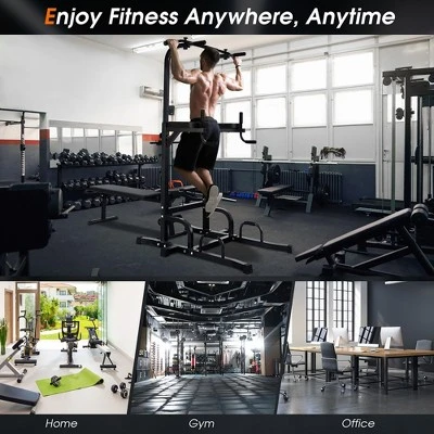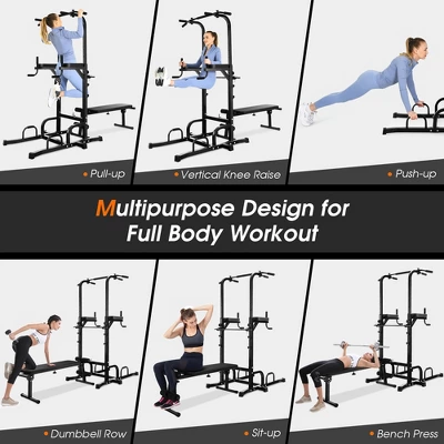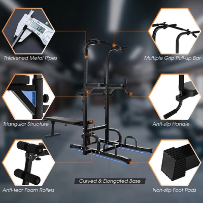 Consisting of a multiple grip pull-up bar, a weight bench and dip station, this multi-function power tower can meet all your fitness needs. It enables you to exercise your whole body muscles, including chest, shoulder, back, abdomen, hip, arm, leg and more. The adjustable height range is 60.5”-81.5”, which fits users of different heights. In addition, equipped with anti-slip handles, anti-tear foam rollers, thick foam bench cushion and elbow pads, this pull up bar dip station will give you a secure and comfortable exercising experience. The heavy-duty metal frame and H-shaped base ensure high stability. Moreover, the weight bench is adjustable, removable and foldable for easy storage.