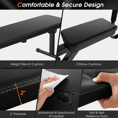 - Comfortable & Secure Design: The 5cm/2” thickness weight bench cushion and 2 elbow cushions are filled with soft & high resilience foam that can reduce impact and muscle fatigue during training. Besides, the waterproof and sweat-proof PU leather surface is easy to wipe clean.