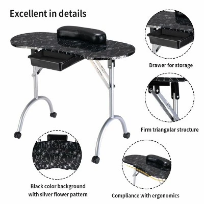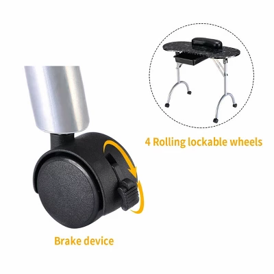 This is our portable Nail Care Desk & Manicure Table which is foldable and comes with a sturdy carrying bag for storage. Equipped with 4 PVC lockable rolling wheels, this table is designed for easy movement. And the durable plastic drawer is perfect for your accessories.