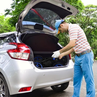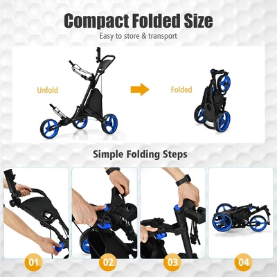 This collapsible golf push cart with 3 wheels is built with a super-strong, lightweight, and sturdy aluminum frame that makes it easily maneuverable. It also has 4 attractive colors that will coordinate with any golf bag. Durable ball bearing wheels with wide wheel base and anti-slide tread will deliver smooth performance round after round. Furthermore, there are plenty of storage space for you to keep your umbrella, drinks, cloths, hats and more. This golf pull carts also features ergonomic padded and height adjustable handle for multiple pushing positions, which could accommodate users of different heights. It is the best choice for all golf beginners and enthusiasts.