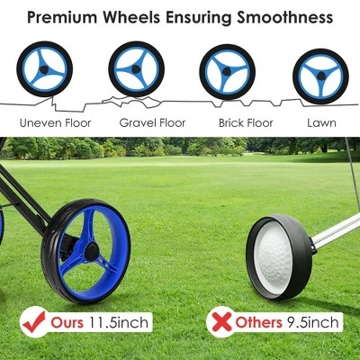 - Large Ball Bearing Wheels: With 10.5” front and 11.5” big rear maintenance-free EVA foam covered ball bearings wheels, our golf trolley ball bearings provide amazing balance and easy mobility on the course and traction on all types of terrain for a smooth movement.