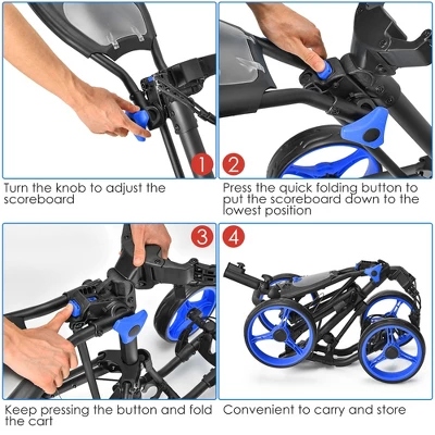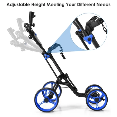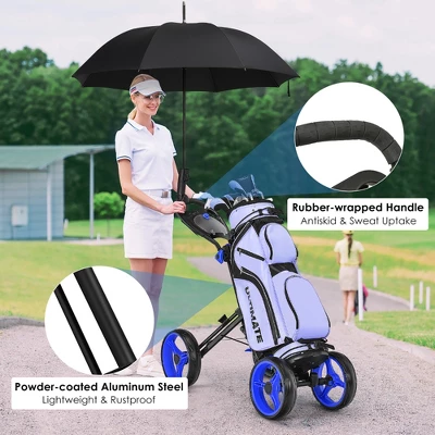 The smart features such as built-in phone holder, umbrella holder, scorecard holder and beverage holder fulfill the expectations that go along with the multi-functional golf push cart. Furthermore, it has four high density and durable EVA foam covered wheels with ball bearings that provide a smooth ride and perfect traction on all kinds of terrain. This golf pull carts collapsible golf bag push cart features ergonomic padded height adjustable handle for multiple pushing positions and to accommodate users of different heights. With a max weight capacity of 30lbs, it is a great helper for both beginners and advanced golf enthusiasts.