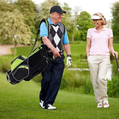 This Brand New Golf Stand Bag Is Perfect For Walking Golfers. It Comes With Shoulder Strap And Full Length Dividers To Protect Your Golf Sticks. The bag is extremely lightweight and easy to carry while you are walking. It comes equipped with a durable stand that has angled feet and a stand lock strap. 7 total pockets Offers Plenty Of Storage Pockets And Convenient Features making organization easy while the double strap provides extra comfort. Do not Hesitate To Buy It! Note:The Golf Sticks In The Pictures Are Not Included In The Package.