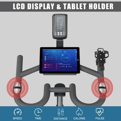 - LCD Monitor & Tablet Holder: LCD monitor tracks the time, speed, distance, calories burned and pulse while you are cycling, helping to reach the best exercising effect. And the heart rate can be detected and received by both hands on pulse detection. Plus, you can put your phone or books on the tablet holder.