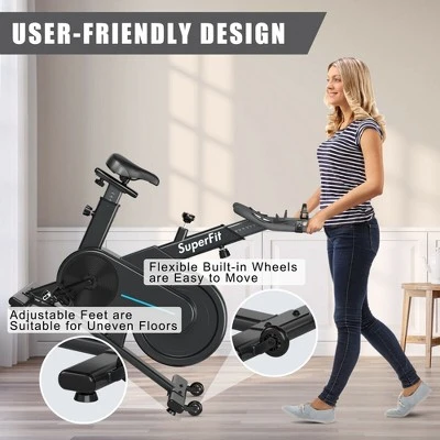 - Smooth & Quiet Riding: Made of sturdy steel frame, our magnetic exercise bike can hold up to 242 lbs and ensures stability while cycling. In addition, the smooth transfer belt provides a smoother and quieter ride than chain transport, which won’t disturb your neighbors or sleeping kids. And the adjustable feet are suitable for uneven floors.