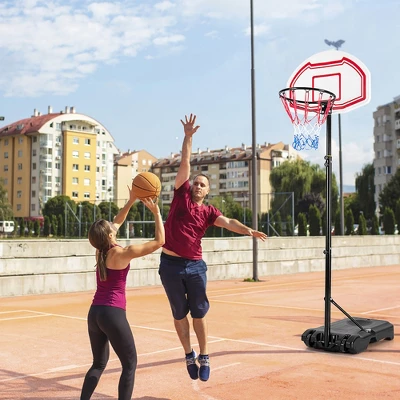 For people of different heights, this basketball stand system is designed with 5 various heights. In addition, the height adjustable basketball system is always available because of the weather resistant materials. Constructed of premium PE material, the backboard is shatterproof for safe use. The steady base can be added with water or sand to enhance stability. And there are 2 all-weather nets for longer service time. When you need to transport it from one place to another, the 2 built-in wheels help a lot. Refer to the clear instruction for simple installation.