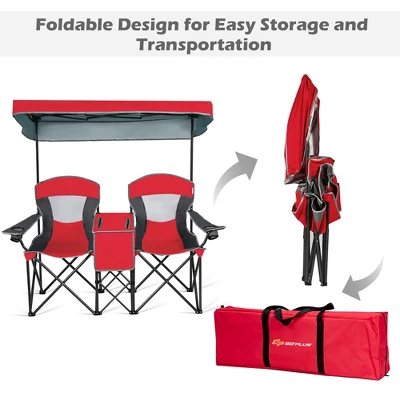 This double sunshade folding chair will provide you with large shelter and comfortable outdoor experience.Crafted of heavy-duty steel frame and premium oxford fabric, this folding chair is sturdy and fade-resistant for durable usage. It also includes a detachable canopy to block sun on hot summer days. There is a beverage holder to keep drinks cool and cup holder on both armrest of chairs. Also, a storage bag provides additional space to place items. The double chair and canopy can be folded down to a compact size and fit into a carrying bag for easy transporting. Perfect for beach, camping, backyard or anywhere you want to relax, this double sunshade folding chair is an ideal choice for you to enjoy leisure time with friend or family.