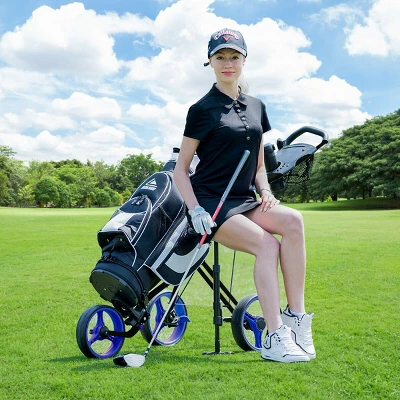This is our new foldable 3 wheel golf trolley with a seat, which is perfect for golf exercising and resting. It allows you to transport golf to clubs or golf courses. Foldable design with 3 removable wheels enhances effortless mobility and storage. Welcome! High quality with competitive price can be realized here!