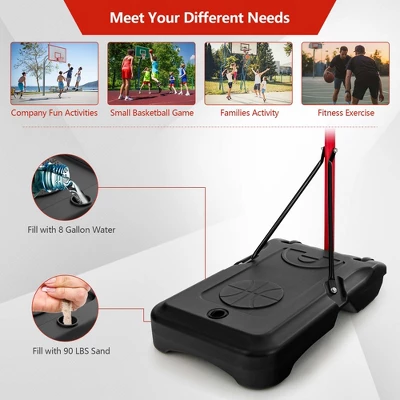 Are you bothered by no place to play basketball? This portable basketball hoop is the perfect solution for you! By moving this basketball stand with 2 built-in wheels, you can easily transport it to the desired place no matter whether indoor or outdoor. After that, you can adjust the height according to your different needs. Furthermore, the fillable base allows you to pour water or sand inside to keep it stable. Thanks to its anti-rust steel frame and weather-resistant nylon net, you can keep it outside for great convenience.