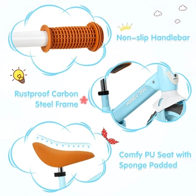 Coming with footrests and 120° limit steering, our no-pedal balance training bike witnesses your lovely children from pushing, gliding to riding this beginner toddler bike safely and independently. What’s more, the adjustable handlebar and seat meet different height needs, making it suitable for kids aged from2 to 5 years. Additionally, the anti-slip and inflation-free EVA wheels with built-in bearing allow children to ride smoothly and safely on multiple grounds. Plus, kids will enjoy comfortable riding thanks to the soft saddle-shaped seat and non-slip handlebar.